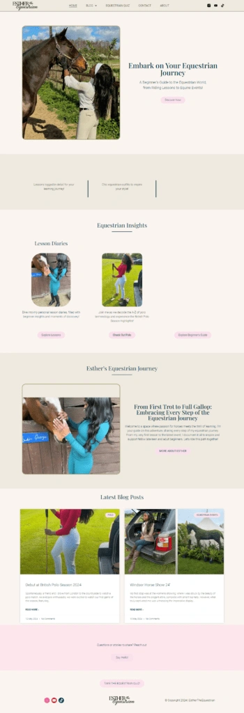 We conducted a thorough audit of their website and social media to identify the core issues. The Esther, the Equestrian website, had dated graphics, took a long time to load, and didn’t have any engaging features like booking systems or frequently asked questions for people who might be interested in hiring Esther. The website’s style could have been cleaner, with big blocks of text and bad formatting that made it hard to find your way around. We rolled up our sleeves and came up with the following answers for Esther the Equestrian once we understood her problems.
